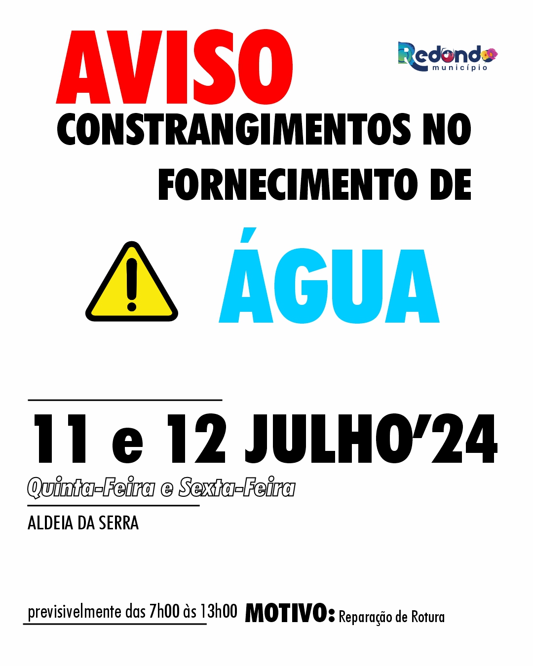 Aviso de Constrangimentos no Fornecimento de Água – Aldeia da Serra 11 e 12 de julho 2024