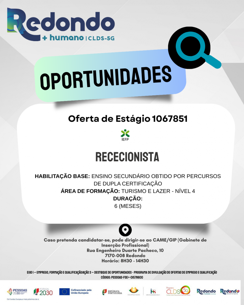 Início > Notícias > CLDS-5G Redondo + Humano | Eixo 1: Ação 3 – Dest@que de oportunidades – Rececionista