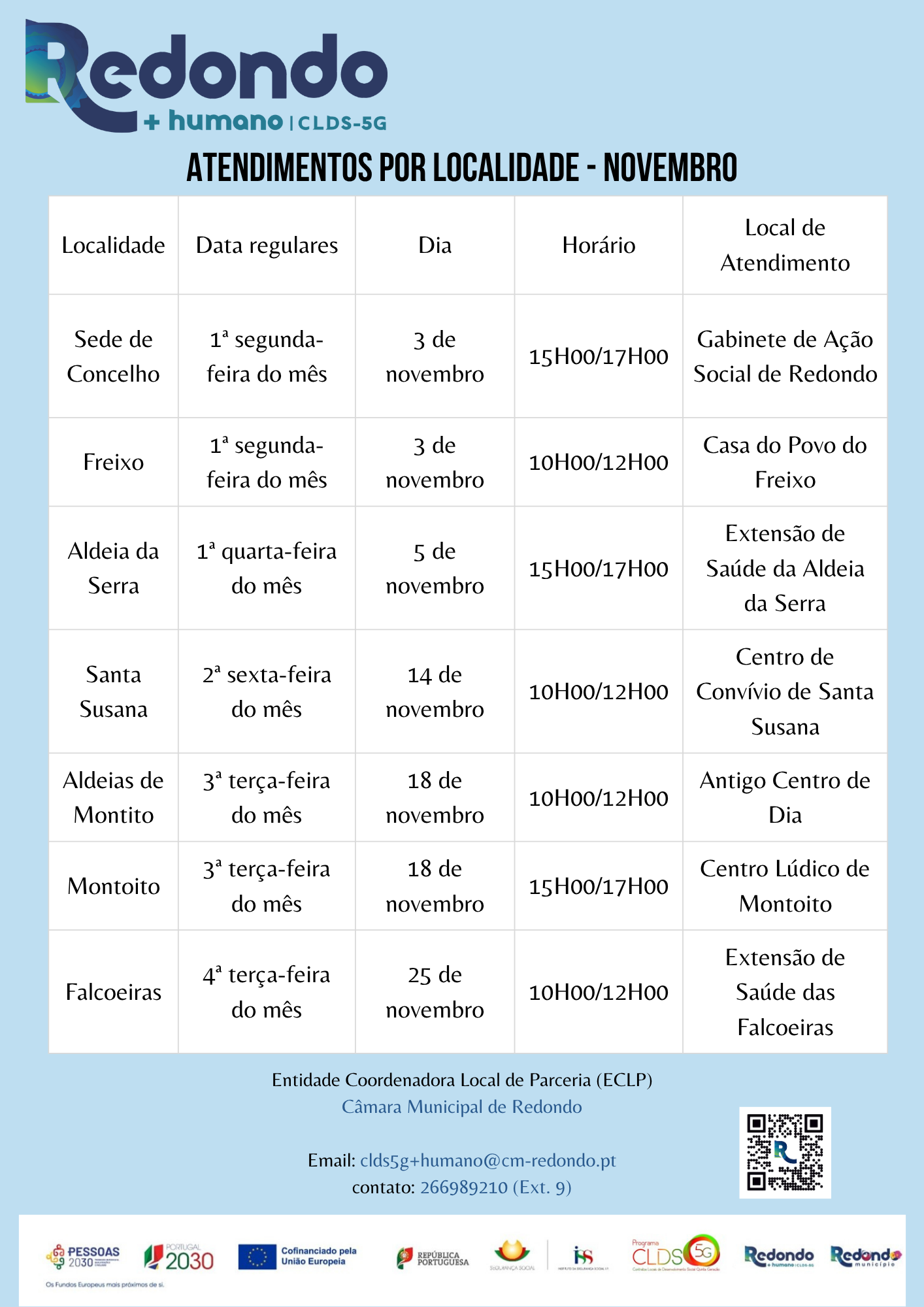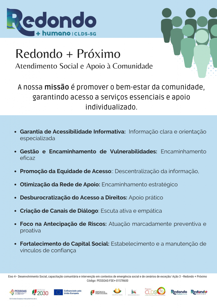 No âmbito do programa CLDS 5G Redondo + Humano, o projeto Redondo + Próximo tem por objetivo aproximar pessoas, serviços e soluções, promovendo o bem-estar de todos os que vivem no concelho de Redondo. Acreditamos que ninguém deve ficar para trás — por isso, trabalhamos lado a lado com a comunidade, garantindo apoio personalizado, acesso a serviços essenciais e respostas adaptadas a cada situação.