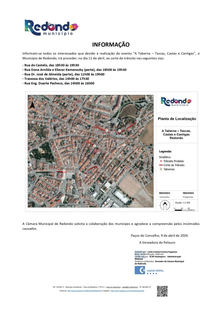 Início > Notícias > Corte de trânsito: “A Taberna – Tascas, Castas e Cantigas” | 11 de abril | Redondo