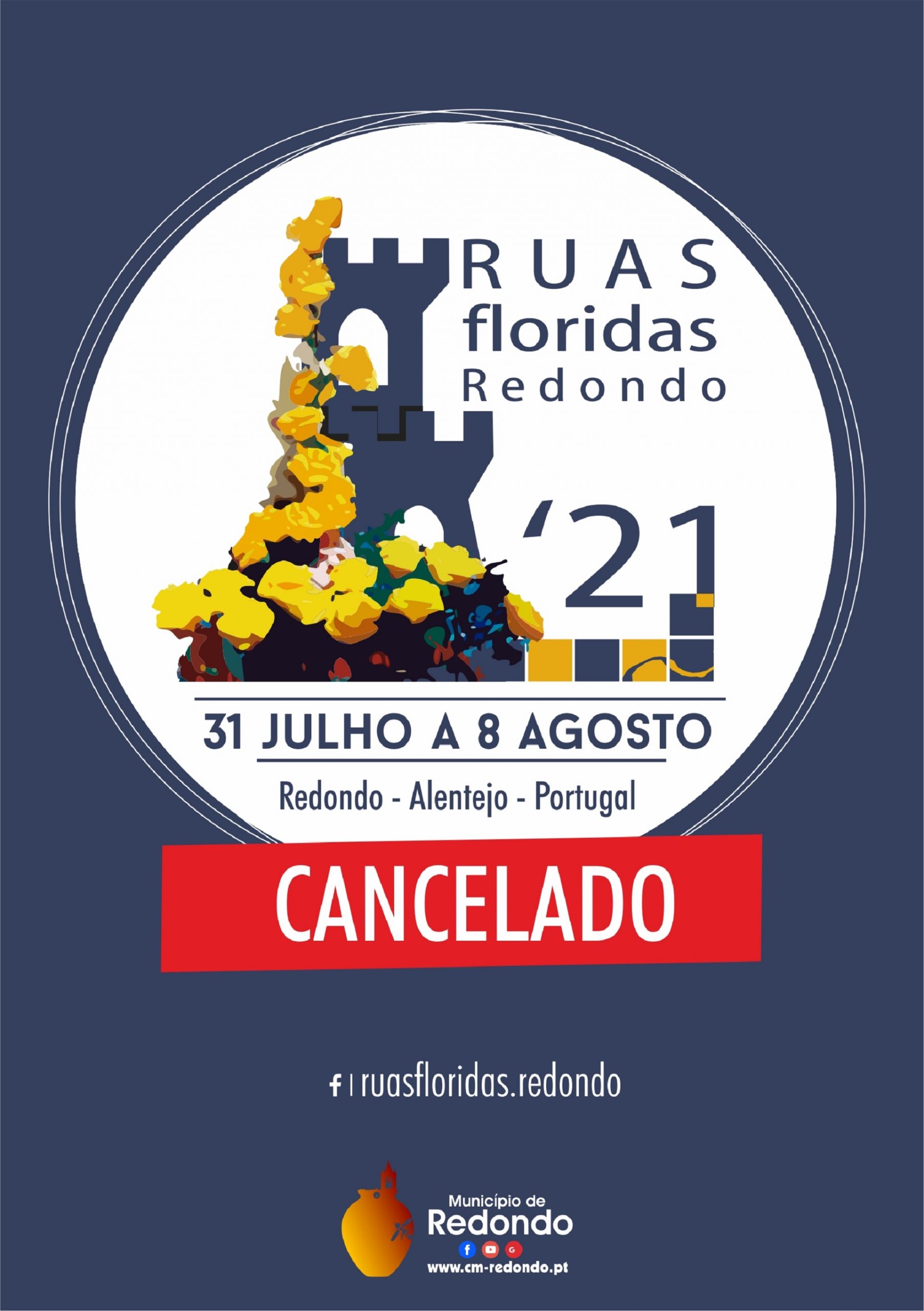 Atualizado em 02/11/2021A Câmara Municipal de Redondo deliberou, na sua Reunião de dia 10 de março, cancelar a edição de 2021 das Ruas Floridas, que estava prevista entre os dias 31 de julho e 08 de agosto, no uso das competências que a lei lhe confere e tendo em consideração a salvaguarda da saúde individual e coletiva, no quadro do combate à pandemia.