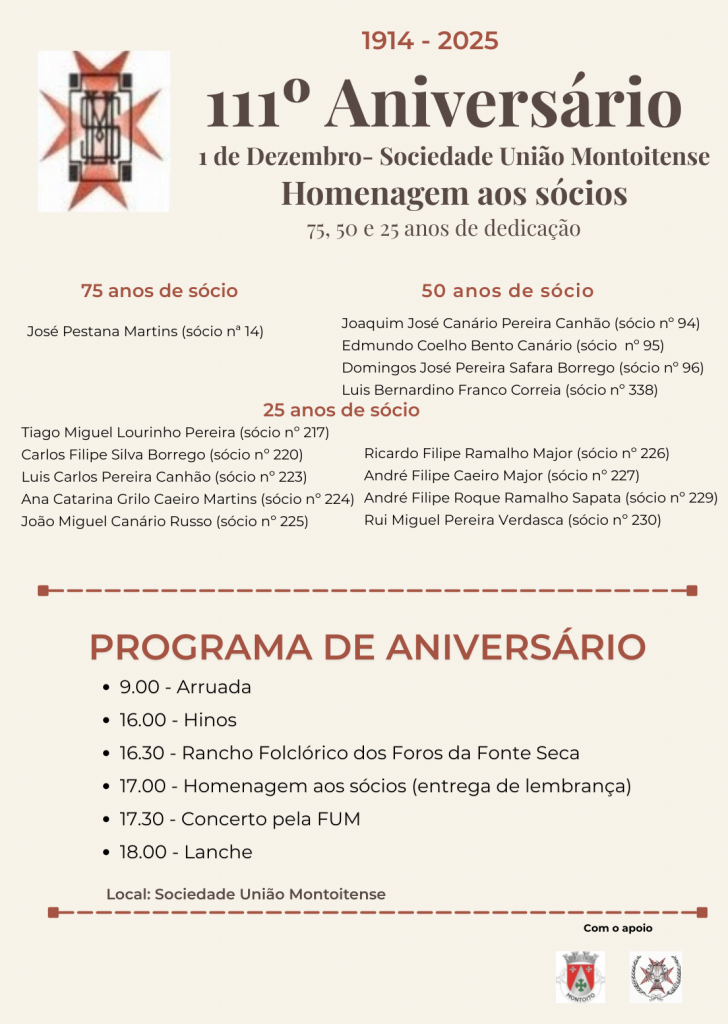 Início > Eventos > 111º Aniversário da Sociedade União Montoitense | 01 de Dezembro | 09h00 | Sociedade União Montoitense