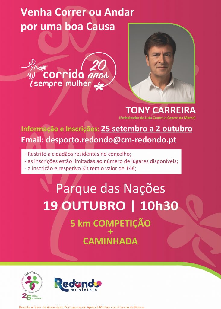 Pode inscrever-se enviando um email para desporto.redondo@cm-redondo.pt. O valor das inscrições vai reverter para a Associação Portuguesa de Apoio à Mulher com Cancro da Mama.