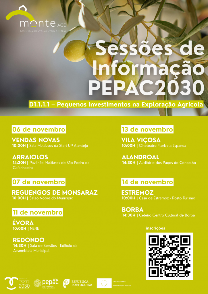 O objetivo destas sessões é informar agricultores, produtores e empreendedores rurais sobre as oportunidades de financiamento disponíveis no âmbito do PEPAC 2030, incentivando o investimento sustentável e a inovação nas explorações agrícolas do Alentejo Central.