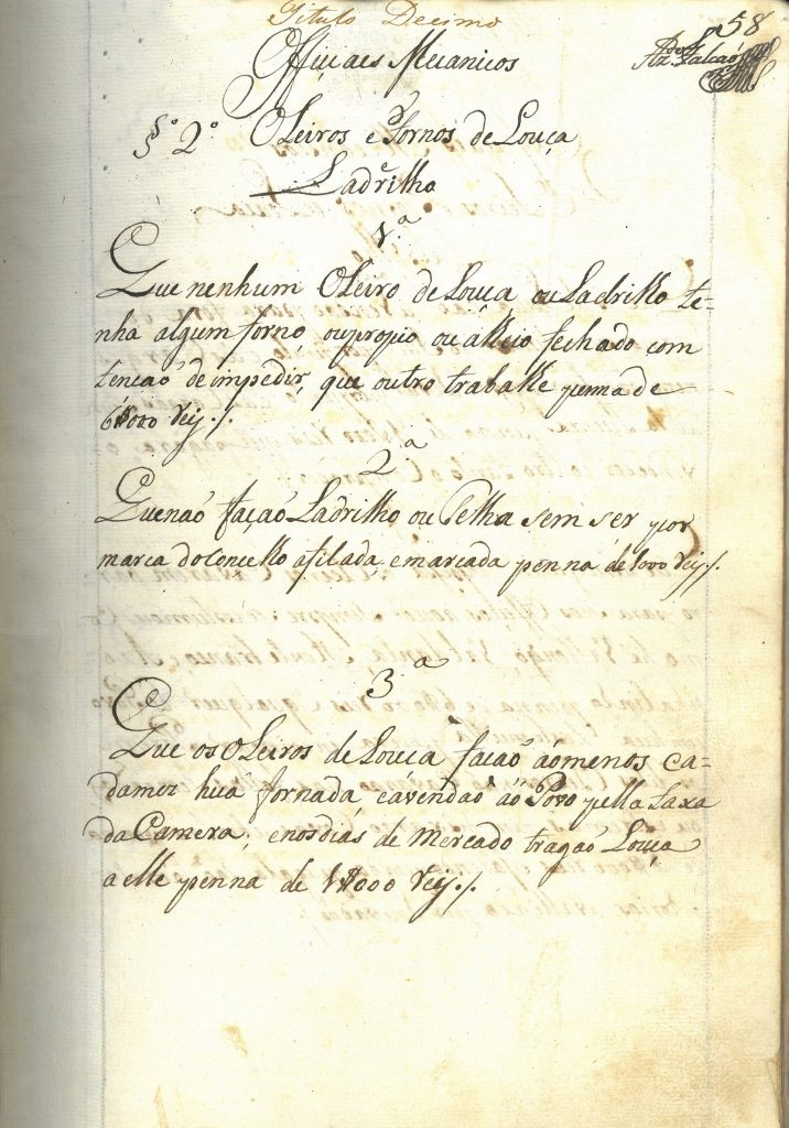 Os oficiais mecânicos como os lagareiros “sendo achados com azeite fora do lagar paguem cada um 1000 reis…” (fl.57) e os oleiros “de louça façam ao menos cada mês uma fornada e a vendam ao povo pela taxa da câmara; e nos dias de mercado tragam louça a ele pena de 1000 reis” (fl.58). Os sapateiros, forneiros, ferreiros, ferradores e outros ofícios mecânicos também tinham de cumprir os seus artigos.