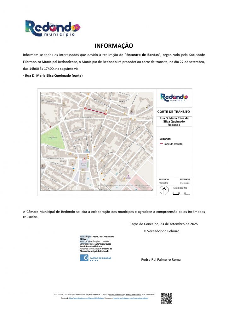 Informação: Corte de trânsito | Encontro de Bandas Filarmónicas | dia 27 de setembro | Redondo