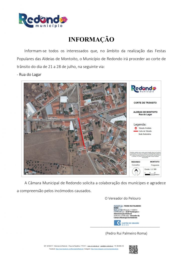 Informação: Corte de trânsito | Rua do Lagar | Aldeias de Montoito