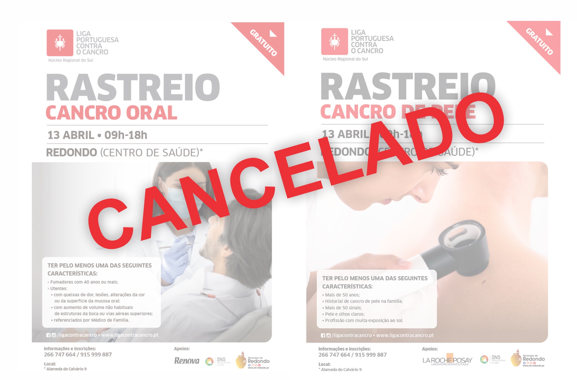 Por indicação do Núcleo Regional do Sul da Liga Portuguesa Contra o Cancro, e por motivos alheios ao Município de Redondo, informamos que os Rastreios do Cancro da Pele e do Cancro Oral, que estavam agendados para o dia 13 de abril, no Centro de Saúde de Redondo, estão cancelados.